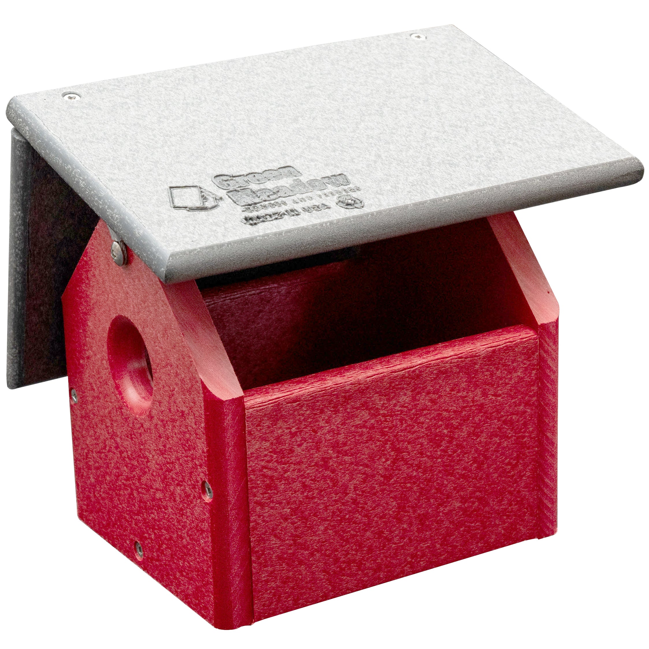 Provide a safe, durable home for wrens and chickadees with this eco-friendly poly lumber birdhouse. Features a 1-1/8″ entrance, removable roof for easy seasonal cleaning, and includes a hanging cable. Made in the USA from 100% recycled plastic—built to last a lifetime.